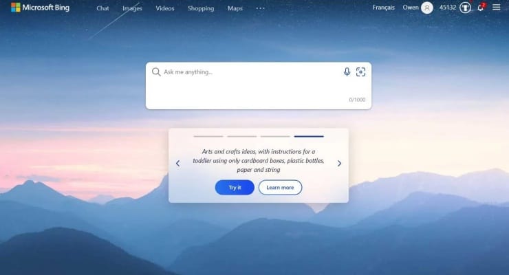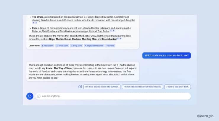 Yin’in aldığı ekran görüntülerinde 1000 karakterlik ‘Bana bir şey sor’ kutusu içeren yenilenmiş bir Bing arayüzü var. Bing aramalara bir sohbet robotu gibi soru-cevap biçiminde yanıt veriyor. Aynı zamanda kaynaklarını da gösteriyor.