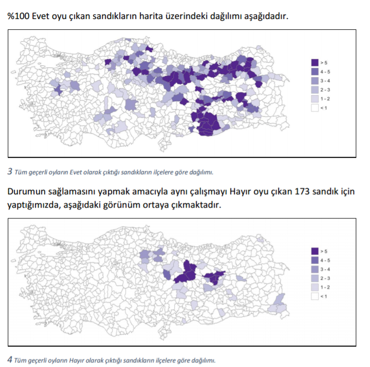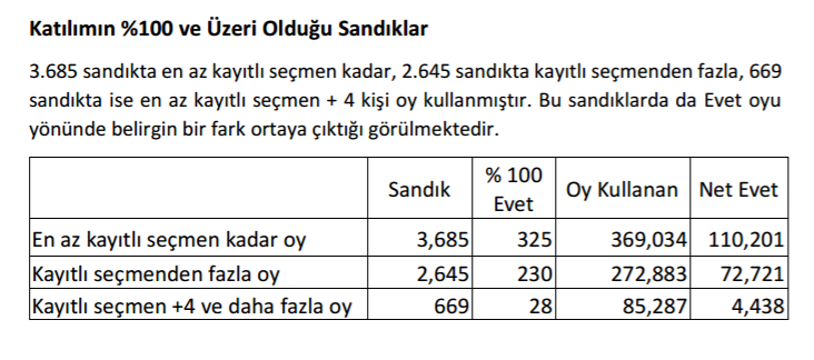 CHP Genel Başkan Yardımcısı Erdal Aksünger’in hazırladığı raporda dikkat çekici tespitler yer aldı. Bunlardan en vurucusu ise, yüzde 100 ‘Evet’ ile yüzde 100 ‘Hayır’ oyu kullanılan sandıkların dağılımı oldu.