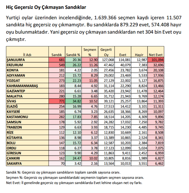 * Yüzde 100 ‘Evet’ oyu çıkan sandıkların illere göre dağılımı şöyle: * Bazı sandıklardansa hiç geçersiz oy çıkmadı. Bu sandıklardan toplam 879 bin, net 304 bin ‘Evet’ oyu çıktı.
