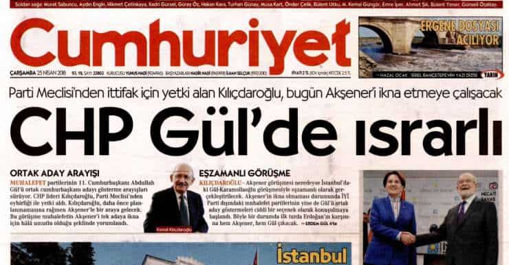 Tezcan, CHP genel merkezinde gazetecilerin konuyla ilgili sorularını yanıtlarken, “Bugün gazetelerde, ’CHP’nin cumhurbaşkanlığı adaylığı konusunda Abdullah Gül ısrarının olduğu’ haberleri yer aldı (Cumhuriyet’in manşetindeki Erdem Gül imzalı ‘CHP Gül’de ısrarlı’ başlıklı haber). Bu doğru mu? Bugün Kılıçdaroğlu, Akşener’e böyle bir öneride bulunacak mı?” diye soruldu.