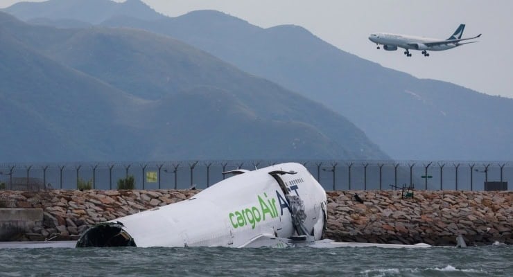 Çin’in Hong Kong bölgesinde Boeing 747 tipi kargo uçağı havalimanına indiği sırada güvenlik aracına çarparak pistten çıktı ve denize sürüklendi. Kazada iki havalimanı görevlisi öldü.