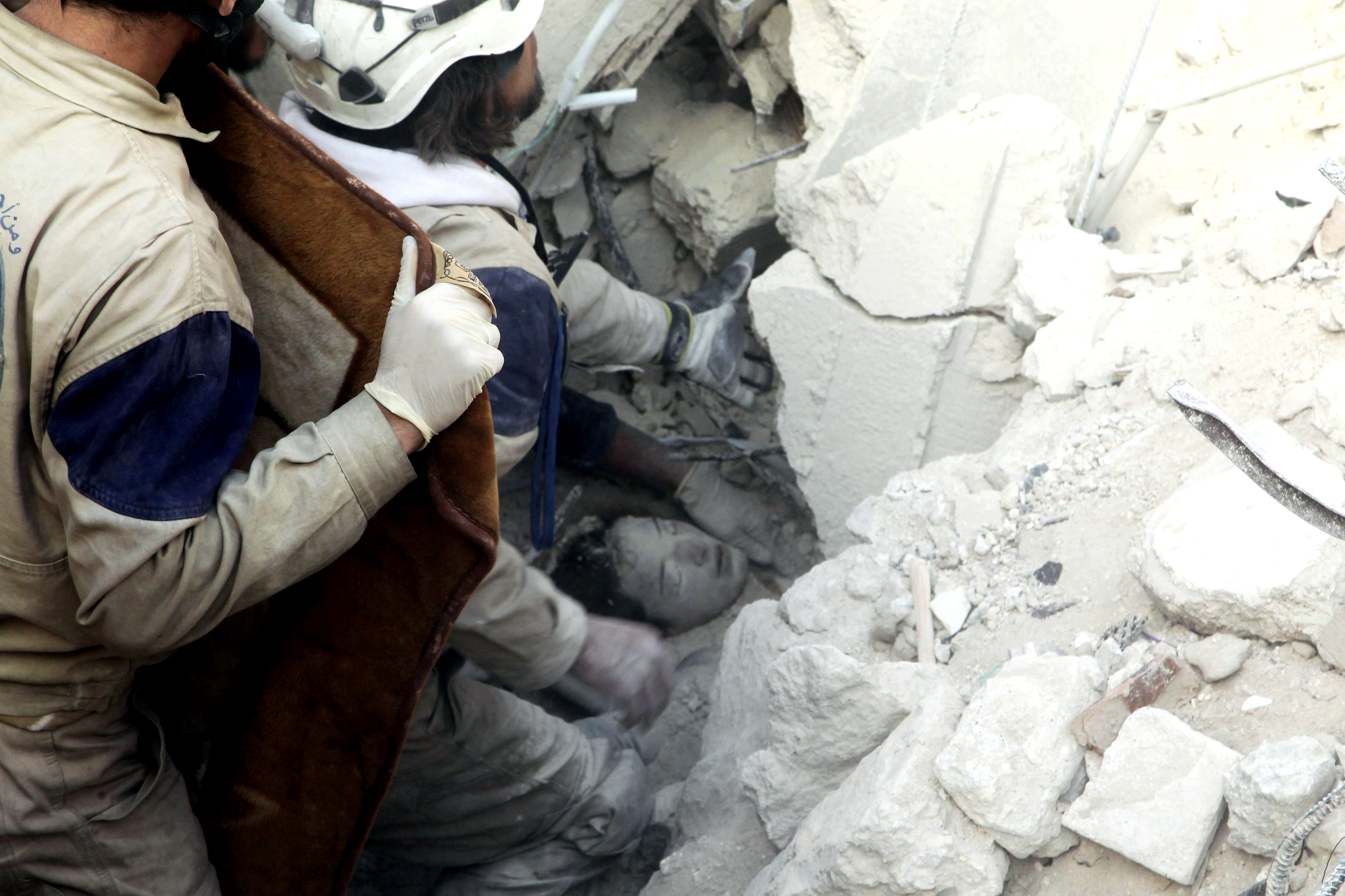 Civil defence members rescue a girl from under the rubble after airstrikes by pro-Syrian government forces in the rebel held al-Qaterji neighbourhood of Aleppo