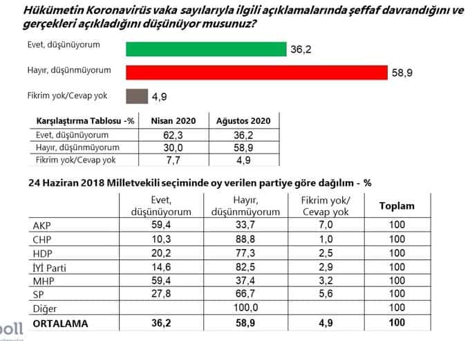 Şirketin ağustos verileri, 2018 yılı genel seçimlerine göre dağıtıldığında; AKP’lilerin yüzde 59.4’ü verilerin şeffaf ve gerçek olduğunu düşünürken yüzde 33.7’si ise verilere inanmıyor.