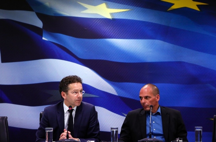 Jeroen Dijsselbloem, (L) head of the euro zone finance ministers’ group, and Greek Finance Minister Yanis Varoufakis listen to a journalist’s question during their common press conference at the ministry in Athens, January 30, 2015. Greece’s government will not cooperate with the EU and IMF mission bankrolling the country and will not seek an extension to the bailout programme, its finance minister said on Friday. REUTERS/Kostas Tsironis (GREECE – Tags: POLITICS BUSINESS)