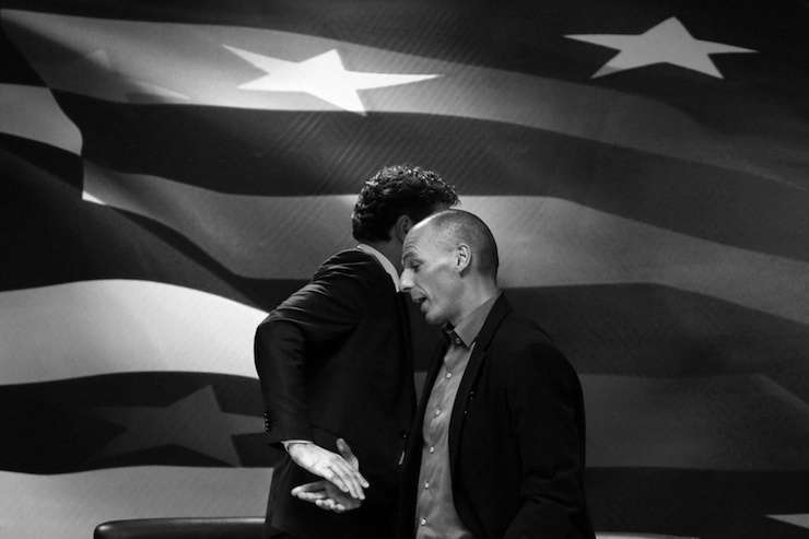 Jeroen Dijsselbloem, (L) head of the euro zone finance ministers’ group, and Greek Finance Minister Yanis Varoufakis shake hands after their common press conference at the ministry in Athens January 30, 2015. Greece’s government will not cooperate with the EU and IMF mission bankrolling the country and will not seek an extension to the bailout programme, its finance minister said on Friday. REUTERS/Kostas Tsironis (GREECE – Tags: POLITICS BUSINESS TPX IMAGES OF THE DAY)