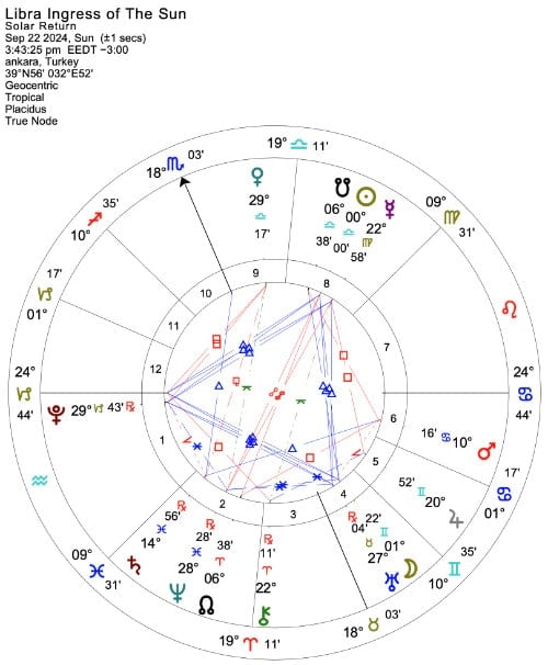 22 Eylül sonbahar ekinoksuyla da 2025 yılının ilkbahar ekinoksuna kadar geçerli ikinci altı ayı yorumlayacağız. İki ekinoks haritasında da görülen benzerlik umut verici. Güneş ve Ay uyum içindeler. Bu yerleşimleri bireysel olarak iç ve dış dünyamızın eleleliği, kollektifte ise toplumlar ve yönetimlerin birbirini desteklemesi olarak yorumlayabiliriz.
