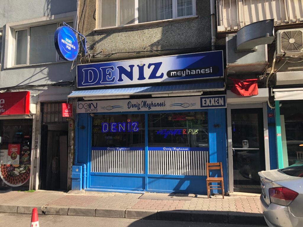 Deniz Meyhanesi, bir tarafı Veliefendi Hipodromu’na ulaşan 10 Temmuz Caddesi üstünde. Büyük tabelası özgün, küçüğü bira mavisi. Dış cephesi kendi özgün mavisiyle boyalı. İçerde de mavi hâkimiyeti var. Duvarların üçte biri mavi boyalı eski tip ahşapla kaplı.