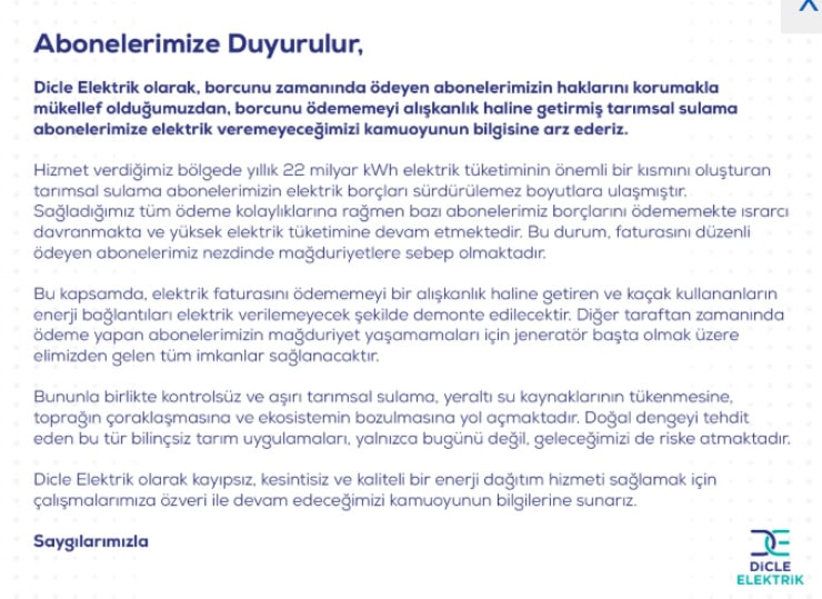 * Dicle Elektrik olarak, borcunu zamanında ödeyen abonelerimizin haklarını korumakla mükellef olduğumuzdan, borcunu ödememeyi alışkanlık haline getirmiş tarımsal sulama abonelerimize elektrik veremeyeceğimizi kamuoyunun bilgisine arz ederiz.