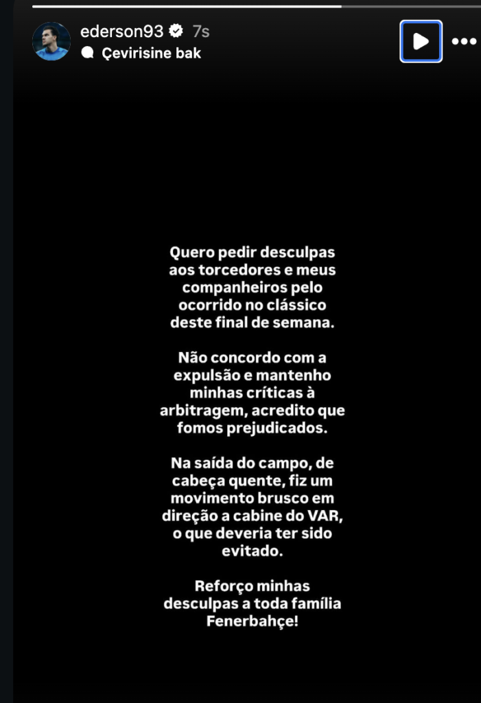 Maçın ardından Instagram hesabından paylaşım yapan Brezilyalı kaleci NTVSpor’un aktardığına göre şunları söyledi: