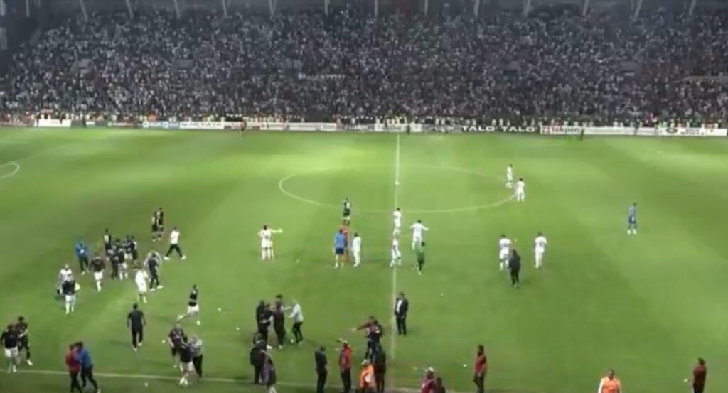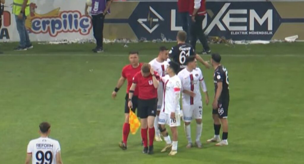 Ancak 56’ncı dakikada Elazığspor’un 1-0 önde olduğu sırada, tribünden atılan bir cisim yardımcı hakem Kadir Beyaz’ın başına geldi. Maçın hakemi Ümit Öztürk, yardımcılarıyla birlikte sahayı terk etti.