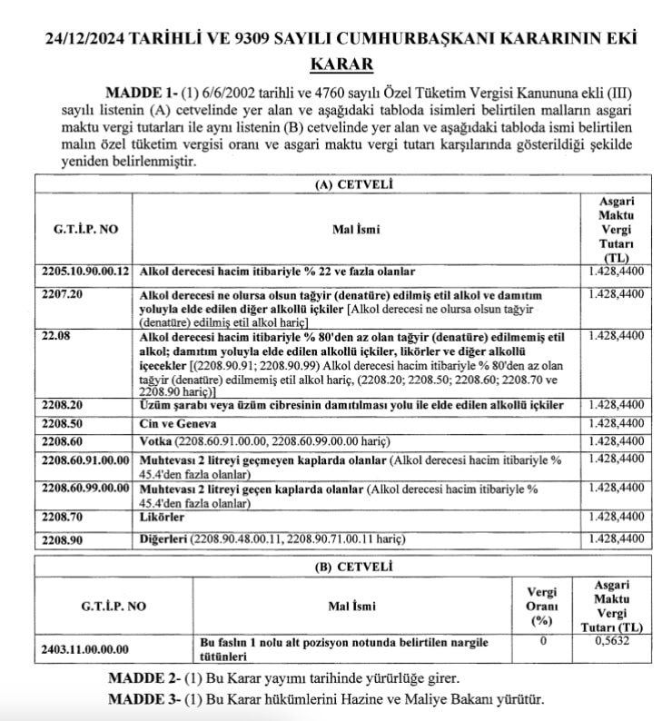 Cumhurbaşkanı Tayyip Erdoğan imzasıyla Resmi Gazete’de yayınlanan karara göre yüksek alkollü ve damıtılmış içkilerin maktu ÖTV tutarına 158,71 lira zam geldi.