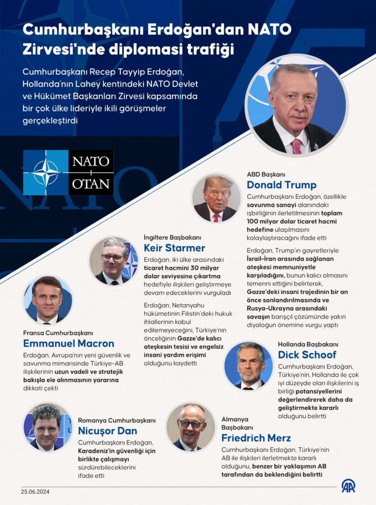 Cumhurbaşkanı Tayyip Erdoğan dün Hollanda’nın Lahey kentindeki NATO liderler zirvesinde ABD, Fransa, ve Almanya başta olmak üzere birçok ülkenin lideriyle görüştü. Gazze, İsrail-İran ilişkileri, ticaret anlaşmaları ve Eurofighter ve F-35 savaş uçakları meseleleri masaya yatırıldı.