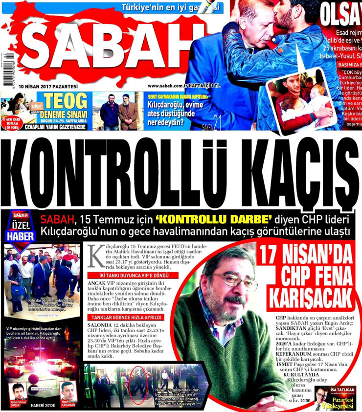 Erdoğan, dün akşam katıldığı Kral FM yayınında Sabah gazetesinin manşetini hatırlatarak, “Kılıçdaroğlu’nun 15 Temmuz gecesi Atatürk Havalimanı’nda VIP’teki görüntüleri kameralara takıldı. Işıldakları olan araçlarla tankların yanına geliyorlar. Orada bir görüşme söz konusu. Darbecilerle temasta bulunuyorlar. ‘Hadi sen gidebilirsin’ diye ona yol veriyorlar. Havalimanında darbecilerle iletişim kurduğunu bilseydim (Yenikapı mitingine) davet etmezdim. Darbecilerle anlaşmış olan birini nasıl davet ederim?” demişti.
