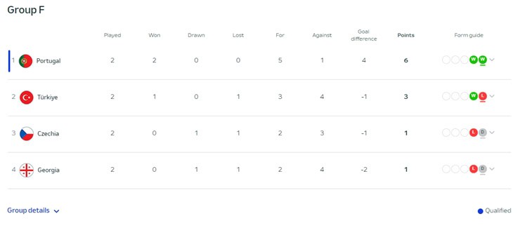 Grupta Türkiye üç, Çekya ve Gürcistan birer puana sahip. Son maçlarda Türkiye – Çekya ve Portekiz – Gürcistan maçları oynanacak.