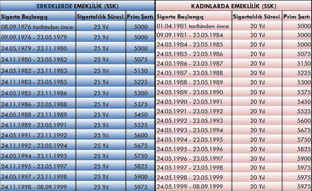 Buna göre 8 Eylül 1999 öncesinde sigortalı çalışmaya başlayanlar yaş dışındaki koşulları yerine getirerek emekli olabilecek. SSK’lılar kademeli prim gününe tabi olacak. Kademeli prim günü 5 binden başlayarak 5 bin 975 güne kadar çıkacak.