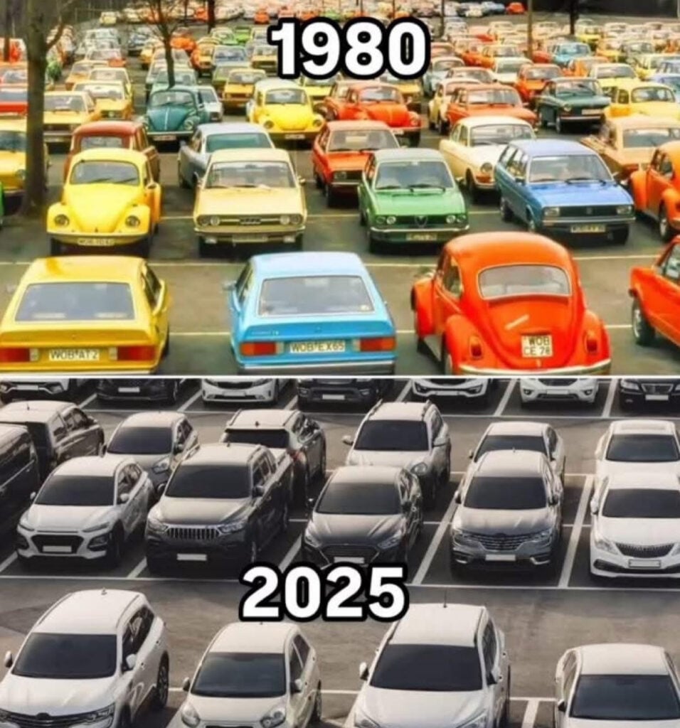 Split image showing a 1980 street scene with many colorful vintage cars above, and a 2025 parking lot with modern white/gray cars below.