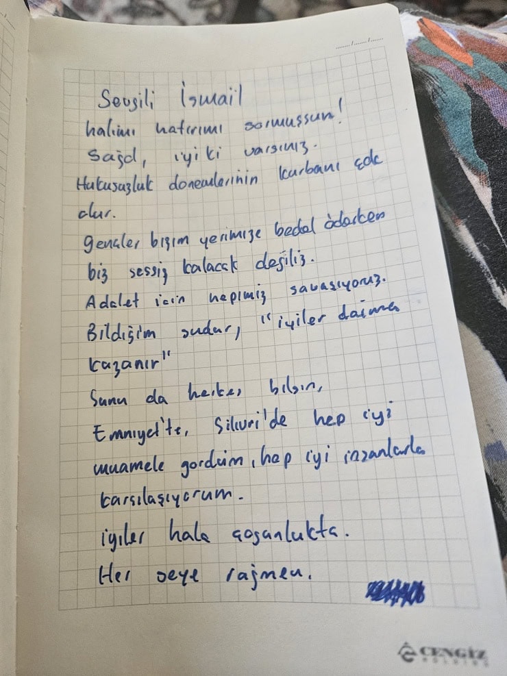 “Sevgili İsmail, halimi hatırımı sormuşsun! Sağ ol, iyi ki varsınız. Hukuksuzluk dönemlerinin kurbanı çok olur. Gençler bizim yerimize bedel öderken biz sessiz kalacak değiliz.