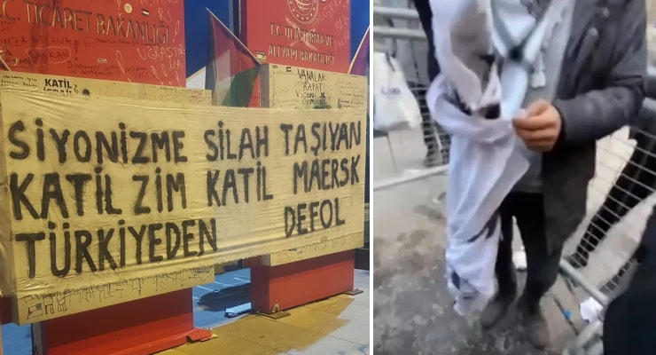Çok sayıda AKP’li ismin de katıldığı yürüyüşe bir grup genç üzerinde “Siyonizme silah taşıyan katil Zim, katil Maersk Türkiye’den defol” yazılı pankartla katılmak istedi.