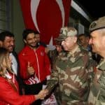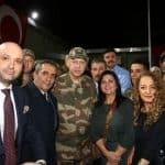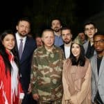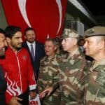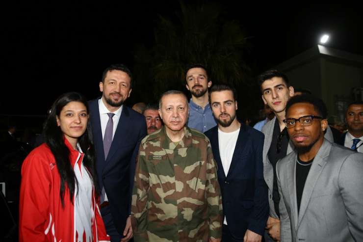 Erdoğan’a Genelkurmay Başkanı Hulusi Akar, bakanlar, futbolcular, basketbolcular, diğer branşlardan sporcular, ünlüler ve bazı gazeteciler eşlik etti.