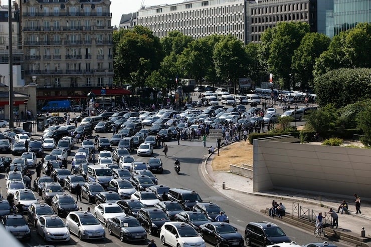 French taxi drivers, who are on strike, demonstrate at Porte Maillot to block the traffic on the Paris ring road during a national protest against car-sharing service Uber, in Paris