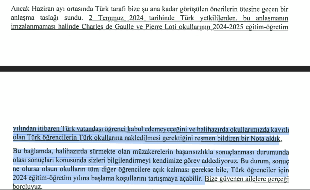 imzalanmaması halinde Charles de Gaulle ve Pierre Loti okullarının 2024-2025 eğtim-ögretim yılından itibaren Türk vatandaşı ögrenci kabul edemeyeceğini ve halihazırda okullarımızda kayıtlı