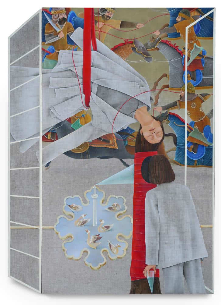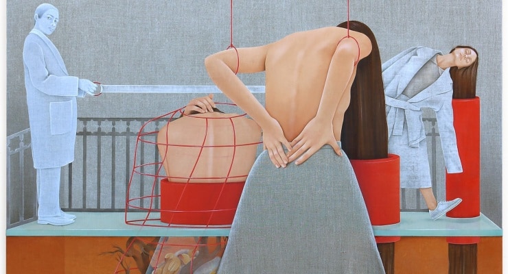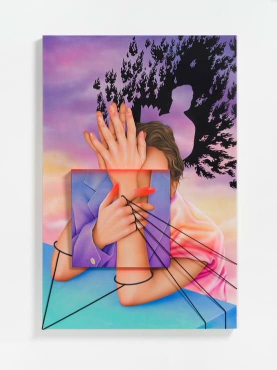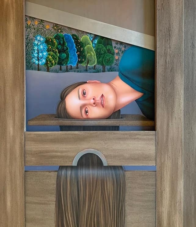 Gerçeküstü resimlerde bir rüyanın içinde gibi görünen kadınlar, genellikle iplerle bağlanmış veya duvarların, çiçeklerin ellerin arkasına gizlenmiş görünüyor.