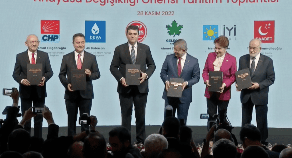 CHP Genel Başkanı Kemal Kılıçdaroğlu, İYİ Parti Genel Başkanı Meral Akşener, DEVA Partisi Genel Başkanı Ali Babacan, Gelecek Partisi Genel Başkanı Ahmet Davutoğlu, Saadet Partisi Genel Başkanı Temel Karamollaoğlu ve Demokrat Parti Genel Başkanı Gültekin Uysal’ın da katılımıyla ‘altılı masa’nın anayasa değişikliği teklifi kamuoyuna açıklanıyor.
