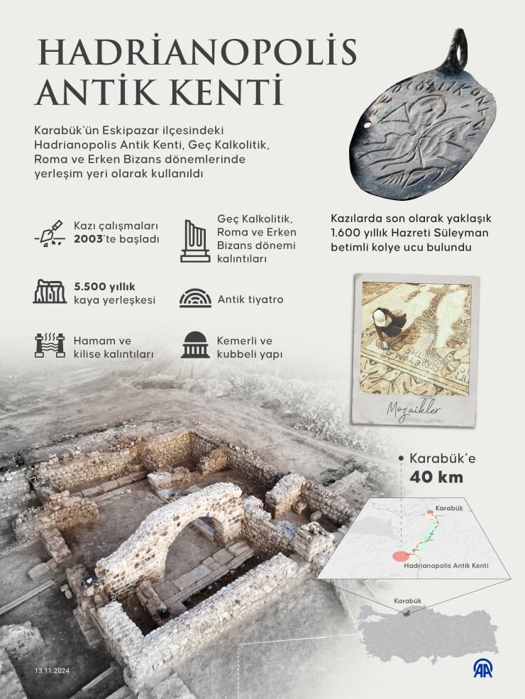Karabük’ün Eskipazar ilçesindeki Hadrianopolis Antik Kenti’ndeki kazılarda yaklaşık 1600 yıllık Hazreti Süleyman betimli kolye ucu bulundu. Doç. Dr. Ersin Çelikbaş, “Üzerindeki betimde Hazreti Süleyman bir at üzerinde elinde mızrakla şeytanı mızraklarken resmedilmiş” dedi.