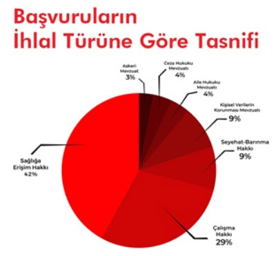 *Bu başvurucudan yüzde 42’si sağlığa erişim hakkına ilişkin mevzuata dayalı hak ihlalleri, yüzde 29’u çalışma hakkına ilişkin mevzuata dayalı hak ihlalleri, yüzde 9’u kişisel verilerin korunması mevzuatına ilişkin hak ihlalleri, yüzde 9’u seyahat-barınma hakkına ilişkin hak ihlalleri, yüzde 4’ü ceza hukuku mevzuatına dayalı hak ihlalleri, yüzde 4’ü aile hukuku mevzuatına dayalı hak ihlalleri ve kalan yüzde 3’ü askeri mevzuata dayalı hak ihlalleri sebebiyle derneğe başvurdu.