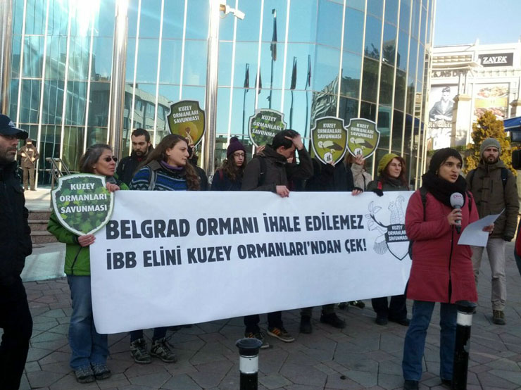 Bina önünde bir araya gelen Kuzey Ormanları Savunması’ndan doğa savunucuları, ‘Belgrad Ormanı ihale edilemez. İBB elini Kuzey Ormanları’ndan çek’ yazılı pankart açtı.