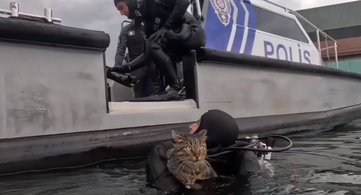 Deniz Liman Şube Müdürlüğü’ne bağlı dalgıç polisler, kediyi bulunduğu yerden çıkarıp kıyıya bıraktı.