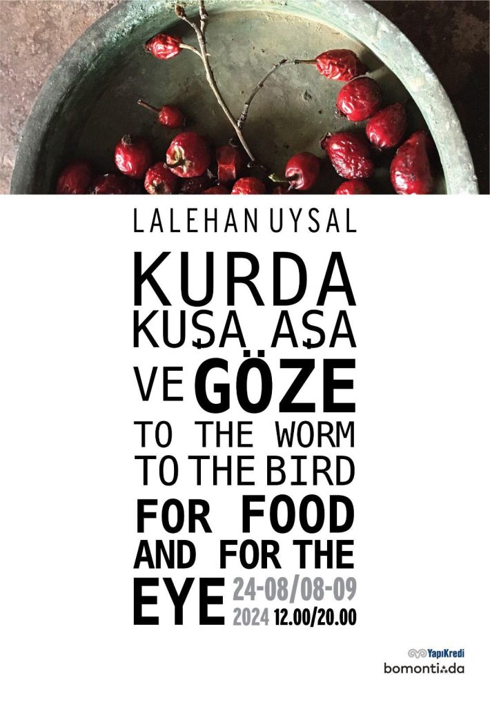 Lalehan Uysal’ın aynı adlı tohum fotoğrafları sergisinin 16’ncısı. Kuzeyden güneye, doğudan batıya Anadolu’nun zengin coğrafyasındaki tohumların fotoğraflarından oluşan bir sergi bu. Sergilerin hepsinin adı aynı. Lalehan Uysal, Anadolu insanının toprağına tohum serperken ektiğinin sadece insan için değil tüm canlılar için olduğuna dair niyeti ‘(Bu tohumlar) kurda, kuşa, aşa…’ ifadesinin sonuna ‘… ve göze!‘ sözcüğünü ekleyerek sergisinin adını koymuş.