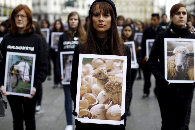 İspanya’nın başkenti Madrid’de hayvanların insanlarla eşit haklara sahip olması gerektiğini savunan Igualdad Animal (Hayvanlar İçin Eşitlik) grubu, Uluslararası Hayvan Hakları Günü nedeniyle ellerinde hayvan fotoğrafları taşıyarak eylem yaptı. (Fotoğraf: Reuters/Paul Hanna)
