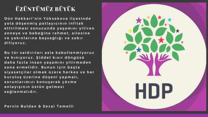 Saldırıyla ilgili Buldan ve Temelli’nin yaptığı ‘Üzüntümüz büyük’ başlıklı yazılı açıklamada şöyle dendi: “Dün Hakkari’nin Yüksekova ilçesinde yola döşenmiş patlayıcının infilak ettirilmesi sonucunda yaşamını yitiren anneye ve bebeğine rahmet, ailesine ve yakınlarına başsağlığı ve sabır diliyoruz. Bu tür saldırıları asla kabullenmiyoruz ve kınıyoruz. Şiddet kısır döngüsü daha fazla insan yaşamını yitirmeden sona ermelidir. Bunun için başta siyasetçiler olmak üzere herkes ve her kuruluş üzerine düşeni yapmalı, sorunlarımızı konuşarak çözme anlayışının üstün gelmesi sağlanmalıdır.”