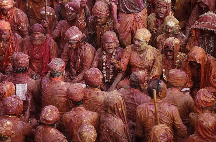 Hindu devotees take part in the religious festival of Holi, also known as the festival of colours, in the Nandgaon temple in Mathura