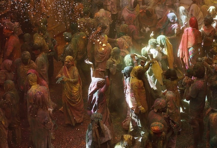 Widows daubed in colours dance as they take part in the Holi celebrations organised by non-governmental organisation Sulabh International at a temple at Vrindavan