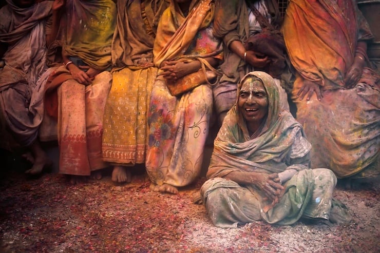 Widows daubed in colours take a break during the Holi celebrations organised by non-governmental organisation Sulabh International at a temple at Vrindavan