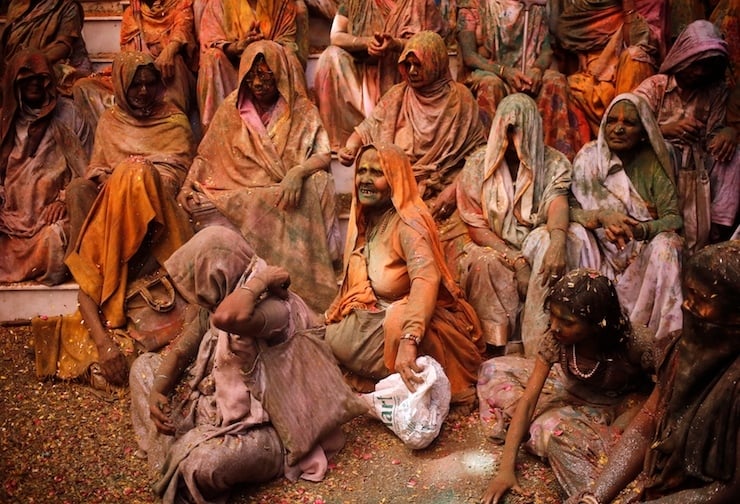 Widows daubed in colours take a break during the Holi celebrations organised by non-governmental organisation Sulabh International at a temple at Vrindavan