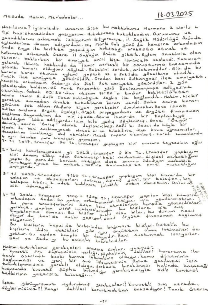 Kaya’nın tarafıma yolladığı mektubunda anlattığına göre hemşire arkadaşı Kaya ile birlikte, 4 Mart’ta yine İl Sağlık Müdürlüğü’nün önünde gözaltına alındılar. İkisi hakkında da İzmir merkezli bir soruşturma kapsamında gözaltı kararı olduğunu söylendi.