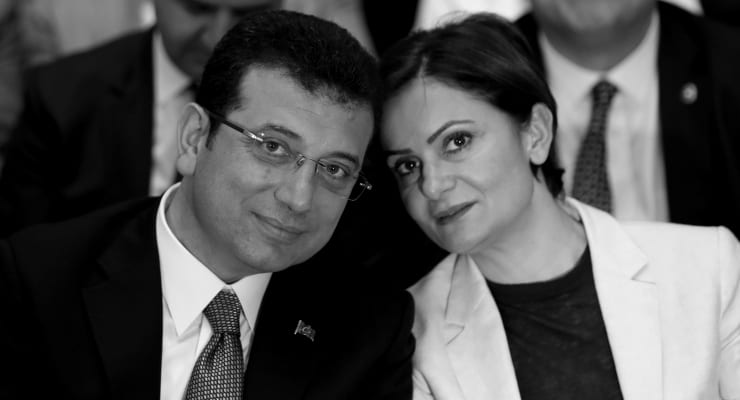 Imamoglu, main opposition CHP's Istanbul mayoral candidate, is pictured with his party's Istanbul chair Kaftancioglu during a campaign coordination meeting in Istanbul