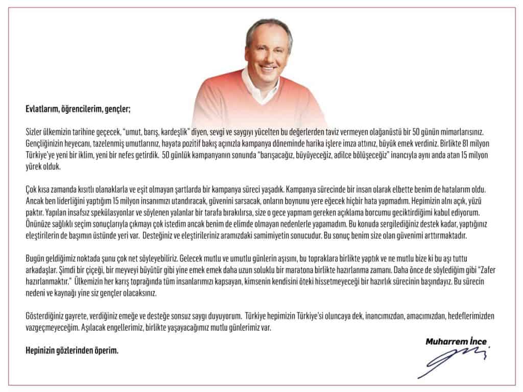 İnce, Twitter’dan “Sevgili gençler, gelecek mutlu ve umutlu günlerin aşısını, bu topraklara birlikte yaptık ve ne mutlu bize ki bu aşı tuttu. Şimdi bir çiçeği, bir meyveyi büyütür gibi yine emek emek daha uzun soluklu bir maratona birlikte hazırlanma zamanı. Zafer hazırlanmaktır” diye başlayan bir açıklama yayınladı.