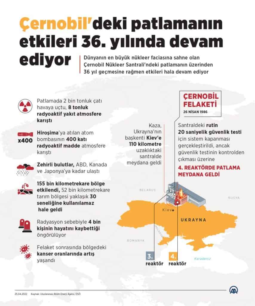 Patlama, Sovyetler Birliği’ndeki santralde 1986’da meydana gelmiş, 7 milyon kişinin zarar görmüştü. Ortaya çıkan radyoaktif bulutlardan Türkiye de etkilenmişti.