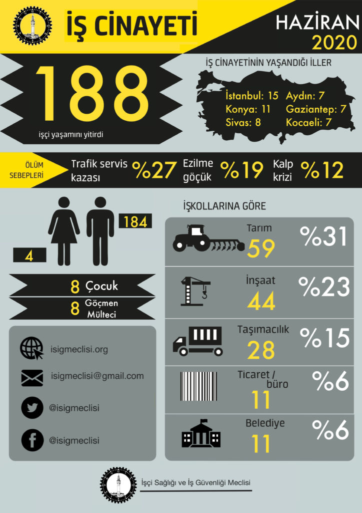 İşçi Sağlığı ve İş Güvenliği Meclisi’nin (İSİG) raporuna göre haziran ayında en az 188 işçi cinayeti yaşandı. Raporda Sakarya’da havai fişek fabrikasında meydana gelen patlama ‘işçi katliamına davetiye’ olarak değerlendirildi.
