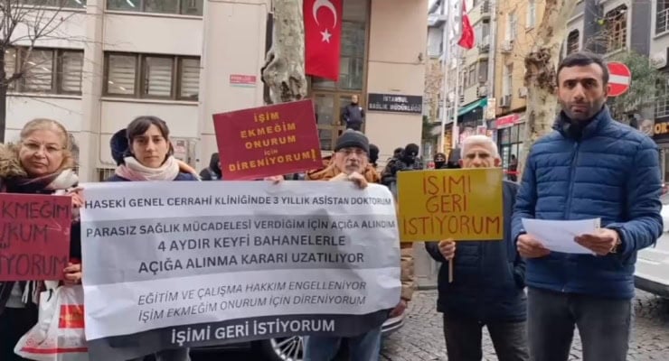 Hakkında kesinleşmiş yargı kararı olmamasına rağmen Haseki Eğitim ve Araştırma Hastanesi’nde genel cerrahi asistanlığı görevinden alınan Dr. Barış Kaya, oturma eylemi yapmak üzere gittiği İstanbul Sağlık Müdürlüğü önünde gözaltına alındı.