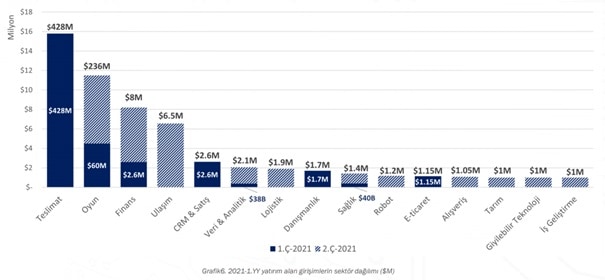 Listede yatırım sayısı olarak oyun sektörü bulunsa da meblağ bakımından zirve ise halen teslimat sektörünün. Bu sektörün yılın ilk altı ayındaki pazar payı şu an 428 milyon dolar. 236 milyon dolarla ikinci sırada oyun sektörü yer alırken üçüncü sıra ise finans sektörünün.