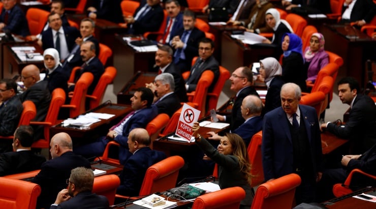 Meclis’te ‘partili cumhurbaşkanlığı’nı içeren anayasa değişikliği teklifinin kavga gürültülerin eksik olmadığı görüşmelerinde vekiller arasında çıkan ‘ısırma kavgası’ seviyeyi iyice düşürdü: AKP’li vekiller genel kurula ‘Köpek giremez’ yazılı kağıtlarla girdi.