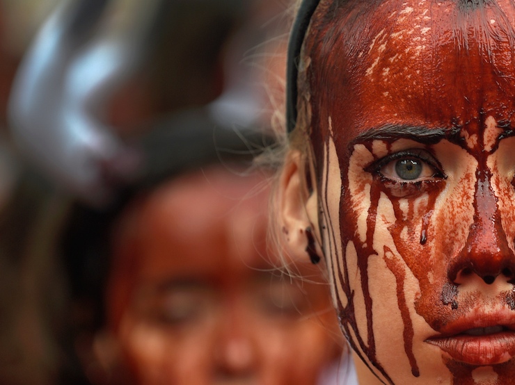 Ana Sayfa İspanya'da hayvan hakları savunucuları, boğa koşusu festivalini 'kanla' protesto etti boga festivali protesto2