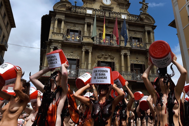 İspanya'da hayvan hakları savunucuları, boğa koşusu festivalini 'kanla' protesto etti