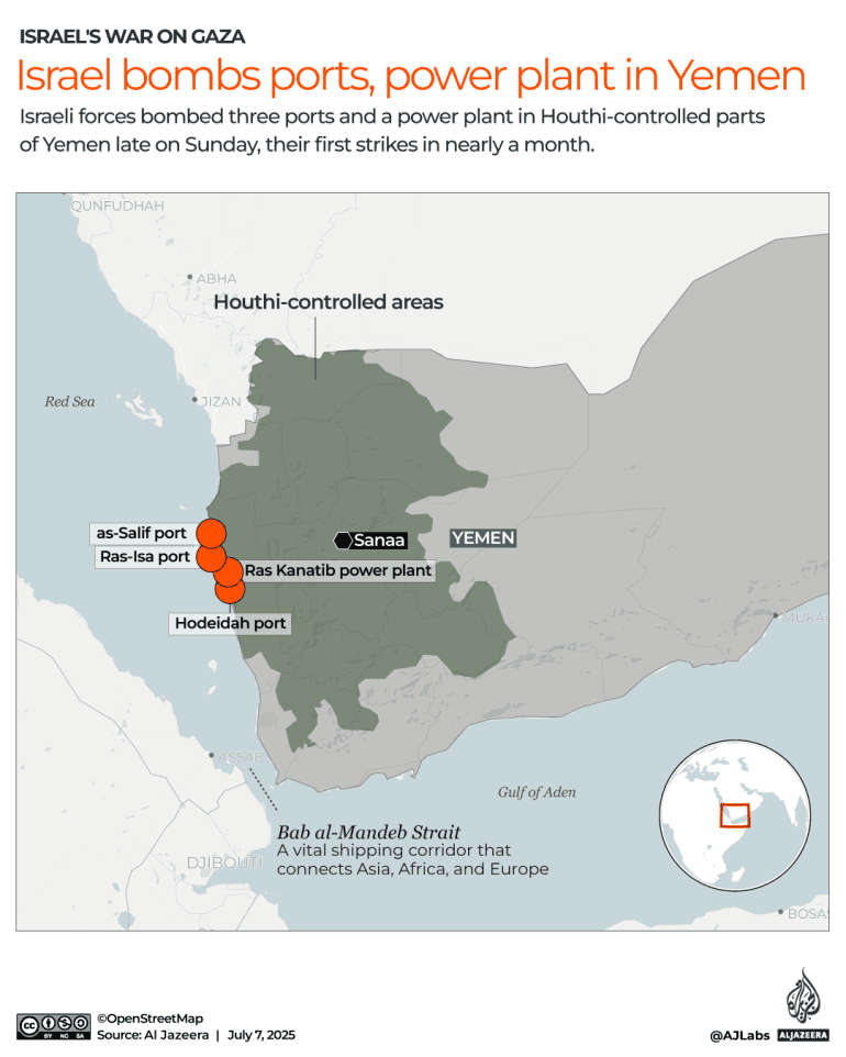 İsrail ordusu pazar Kızıldeniz’deki Hudeyde, Ras-İsa ve es-Selif limanlarını ve Ras Kathib elektrik santralini vurduğunu bildirdi.