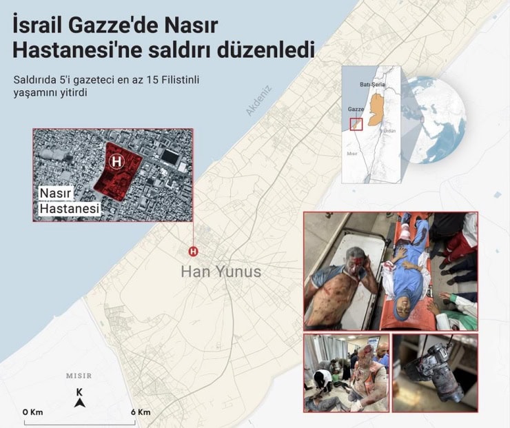 Bu sabah Gazze’nin güneyindeki Nasır Hastanesi’ne iki ay saldırı birden düzenlenmiş, dördü gazeteci, biri sivil arama kurtarma ekibi olmak üzere 15 Filistinlinin öldürülmüştü.
